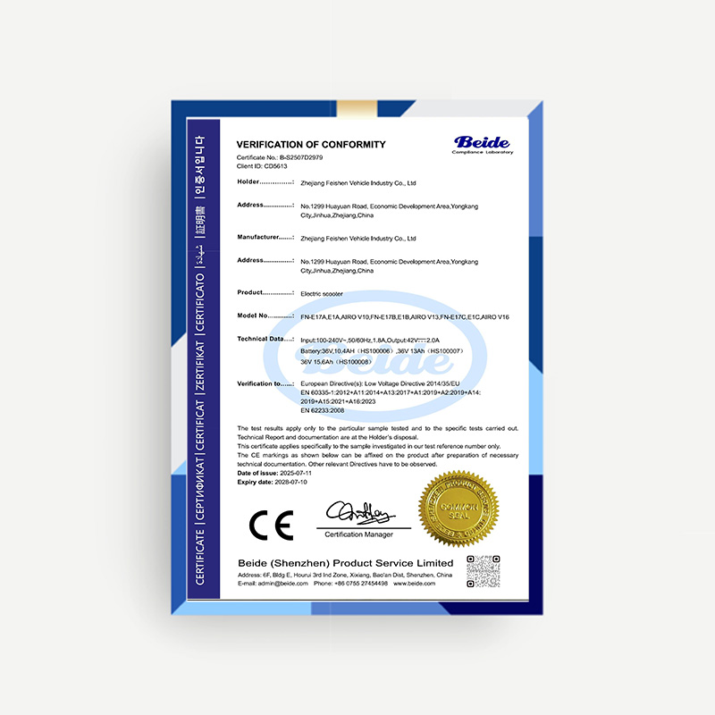 Our products are CE certified and fully comply with EU market requirements, including the EN 17128:2020 standard for electric scooters. Besides,Our electric bicycles are EN 15194 certified and electric mopeds meet the L1e-B category standard, ensuring that our products can safely enter the European market.