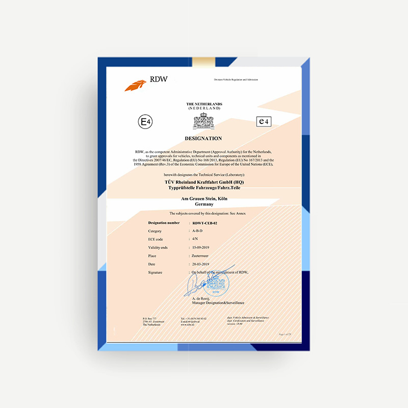 The Netherlands’ RDW testing requirements for electric scooters are particularly stringent. Our company has successfully assisted Dutch clients in obtaining official RDW certification. Our products have undergone rigorous RDW testing, and our quality management system has also been officially recognized by the RDW.