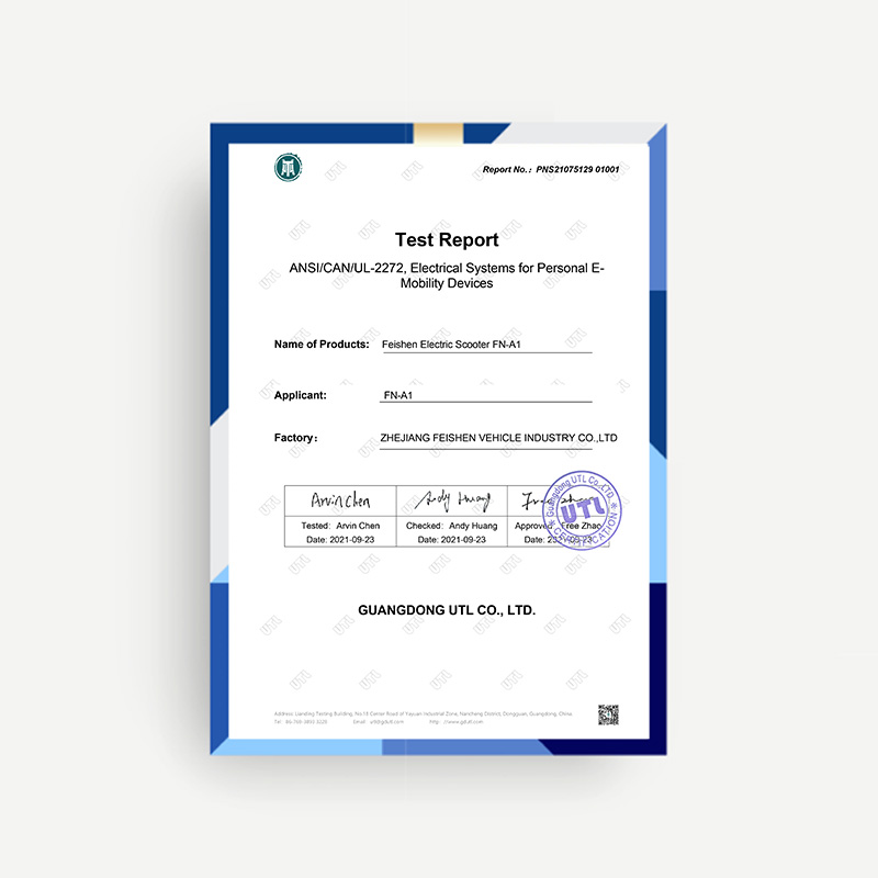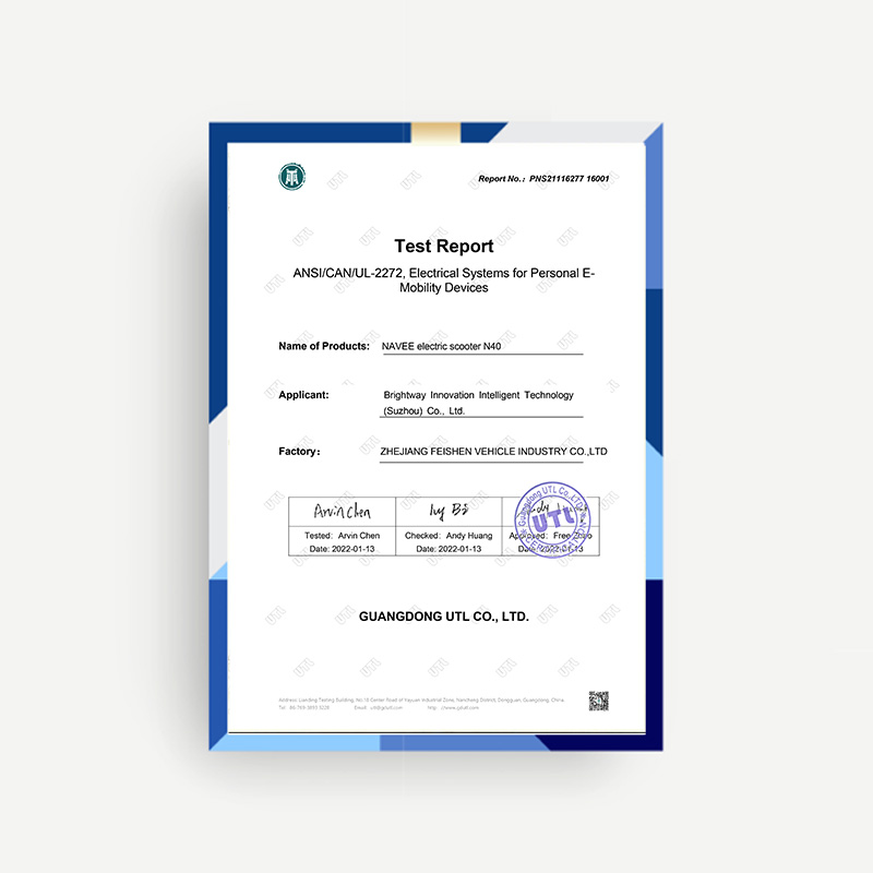 Our products are UL 2272 certified, which assesses the safety of electric scooters’ electrical systems. This allows us to sell our products on major platforms like Amazon and Walmart, even in regions like Europe where it’s not mandatory. Compliance with UL 2272 also enhances our brand’s reputation.